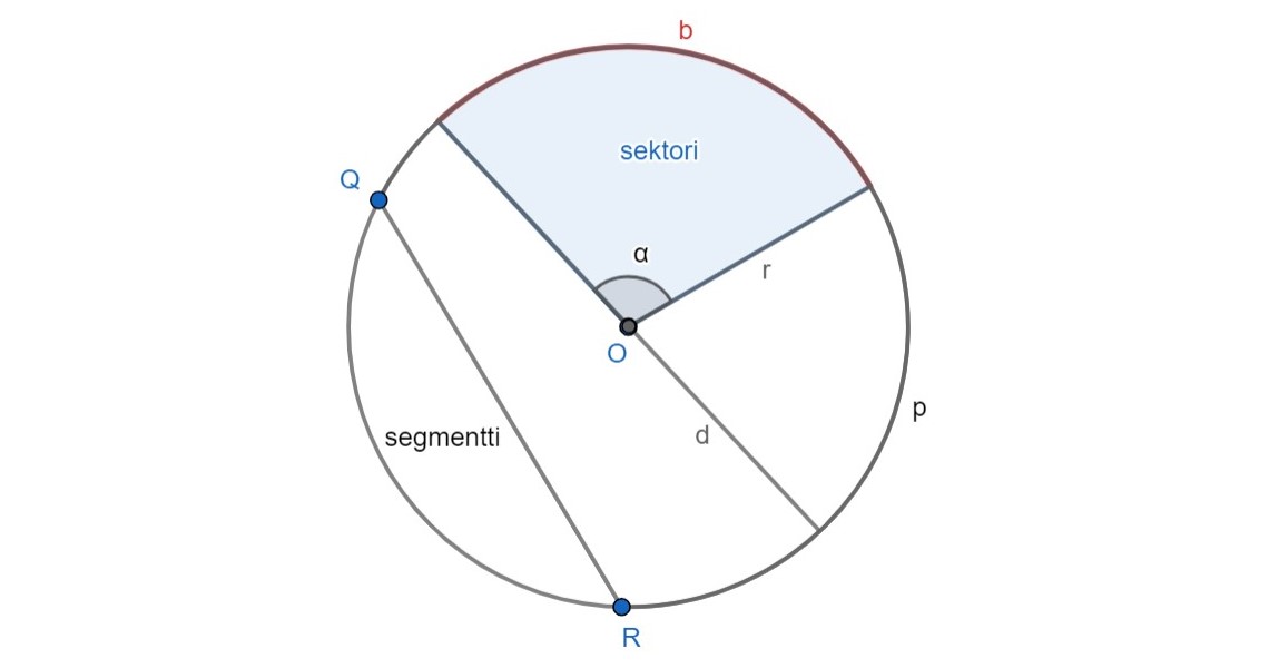 - ympyrän ja sen osien ja siihen liittyvien suorien geometria