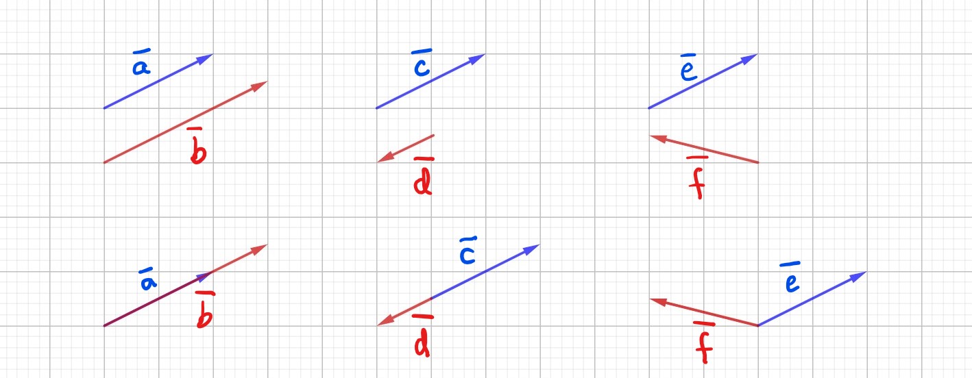 Vektorit \(\bar{a}\) ja \(\bar{b}\) ovat yhdensuuntaiset, jos ja vain jos vektori \(\bar{a}\) saadaan vektorista \(\bar{b}\) kertomalla nollasta eroavalla reaaliluvulla \(t\) eli $$\bar{a}\parallel\bar{b}\quad\Leftrightarrow\quad\bar{a}=t\bar{b}, t\neq0.$$
