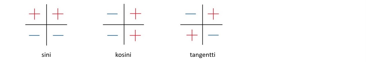 Kulmien sinin, kosinin ja tangentin arvojen etumerkki voidaan päätellä koordinaatiston neljänneksestä, jossa kulman kehäpiste sijaitsee.