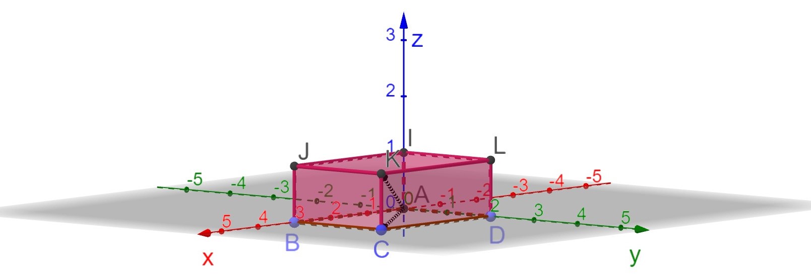 Pohjan lävistäjä vastaa kuvassa vektoria \(\overline{AC}=3\bar{i}+2\bar{j}\) ja avaruuslävistäjä vektoria \(\overline{AK}=3\bar{i}+2\bar{j}+\bar{k}\).